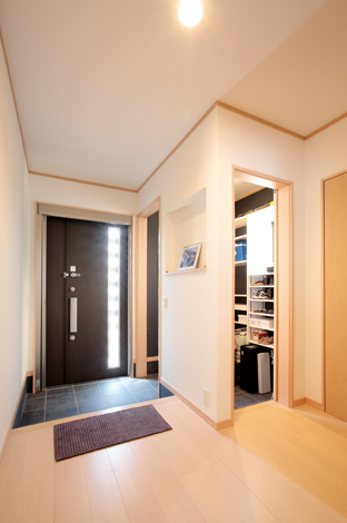 豊橋市 瓦町の家 玄関を入ると右手にシューズクローク 左手にウォークインクローゼット たくさんの収納がある家 重量木骨の家 選ばれた工務店と建てる木造注文住宅